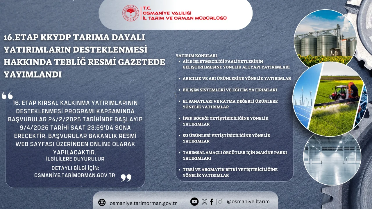 “16.Etap Kırsal Kalkınma Destekleri Kapsamında Tarıma Dayalı Yatırımların Desteklenmesi Hakkında Tebliğ (Tebliğ No: 2024/43) 20 Şubat 2025 Tarih Ve 32819 Sayılı Resmi Gazetede Yayımlandı.