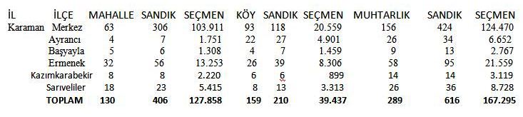 7 Haziran’da yapılacak olan 25. Dönem Milletvekili Genel Seçimi İl/İlçe/Mahalle/Köy Seçmen ve Sandık Sayıları Yüksek Seçim Kurulu (YSK) tarafından açıklandı. Karaman’da İl genelinde Toplam 616 sandıkta 167 bin 295 seçmen oy kullanacak.