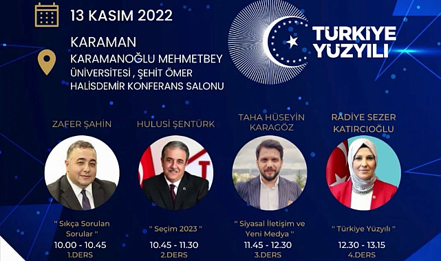 Konuyla ilgili olarak AK Parti Karaman İl Başkanı Abidin Çağlayan, “Teşkilat Akademisi partimizin AR-GE ve Eğitim Başkanlığı’nın eğitim faaliyetleri kapsamında, üç kademe il ve ilçe yönetimlerini kapsayan eğitim programıdır. Karaman teşkilatlarımız ile yapılacak olan ‘Teşkilat Akademisi Türkiye Yüzyılı Eğitim Programı’ toplamda dört oturumdan oluşmaktadır. Zafer Şahin, Hulusi Şentürk, Taha Hüseyin Karagöz, Hulusi Şentürk, Raziye Sezen Katırcıoğlu programımızın katılımcılarıdır. Programımız, 13 Kasım Pazar günü saat 10:00-13:15 saatleri arasında, Karamanoğlu Mehmetbey Üniversitesi Yunus Emre Yerleşkesi Şehit Ömer Halisdemir Konferans Salonunda gerçekleştirilecektir” bilgilerini verdi.