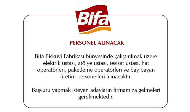Bifa Bisküvi Fabrikası bünyesinde çalıştırılmak üzere elektrik ustası, atölye ustası, tesisat ustası, hat operatörleri, paketleme operatörleri ve bay bayan üretim personelleri alınacaktır.