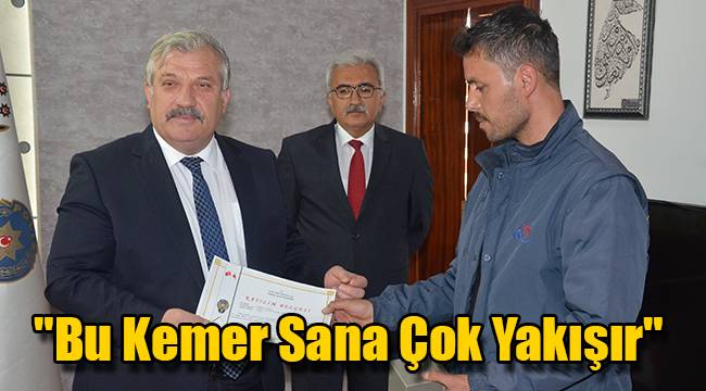 "Bu Kemer Sana Çok Yakışır Yarışması" kapsamında Türkiye genelinde yapılan slogan, afiş ve görsel tasarım alanlarından görsel tasarım alanında "Kemerinizi Bağlayın Emniyeti Sağlayın" başlıklı eseri ile dereceye giren Karamanlı yarışmacı Süleyman Gümüş'e ödülünü Karaman İl Emniyet Müdürü Fikret Bayraktar takdim etti.