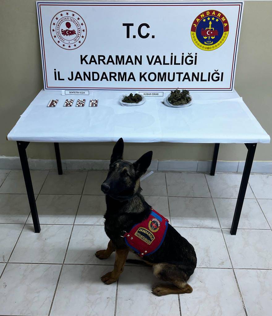 Karaman İl Jandarma Komutanlığı ekipleri, ilimize başka illerden getirilebilecek uyuşturucu/uyarıcı maddelerin yakalanması ve uyuşturucu ile mücadele faaliyetleri kapsamında; M.S ve T.G isimli şahısların Konya ilinden Karaman iline uyuşturucu madde getireceklerinin öğrenilmesi üzerine KOM Şube Müdürlüğü ve Kâzımkarabekir İlçe Jandarma Komutanlığı ekipleri tarafından Kâzımkarabekir ilçesinde durdurulan şüpheli şahısların aracında Elmas isimli Uyuşturucu Madde Arama Köpeği ile yapılan aramada; (121) Gr. Kubar Esrar, (56) Adet Sentetik Ecza (Uyuşturucu Hap) ele geçirildi.