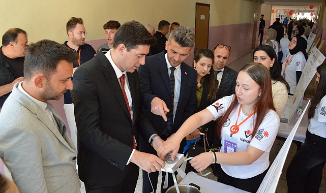 4006 - TÜBİTAK Bilim Fuarlarını Destekleme Programı kapsamında destek almaya hak kazanan okulda, öğrencilerin hazırladığı projeleri ve stantları inceleyen Kaymakam Erdoğan, projenin hayata geçmesinde ve bilim fuarının düzenlenmesinde emeği bulunan öğretmen ve öğrencileri tebrik ederek, başarılı çalışmalarının devam etmesi temennisinde bulundu.
