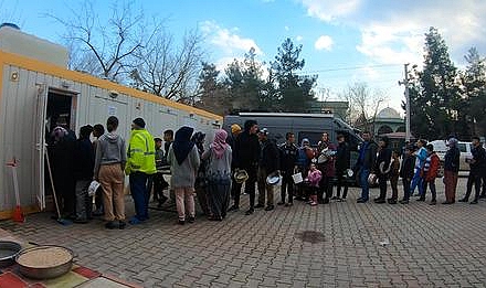 Çadır kentlerde yaşayan 350-400 kişiye akşam saatlerinde etli patates, makarna ve helvadan oluşan ilk yemeği vatandaşların getirdikleri kaplara kişi sayısı kadar servis yapılırken bu davranış depremzedeler tarafından takdirle karşılandı.