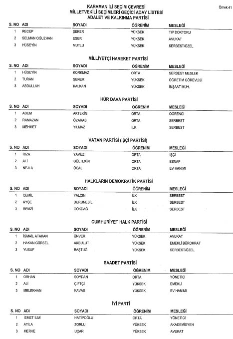 Yayınlanan Geçici listede Partilerin Karaman Milletvekili adayları şöyle sıralandı.