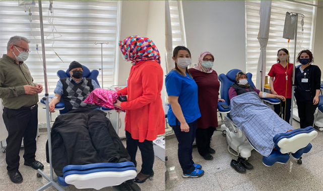 Karaman Eğitim ve Araştırma Hastanesi’nde görev yapan hemşireler kemoterapi tedavisi ile kanseri yenen hastaya kendi ördükleri battaniyeyi hediye ettiler.