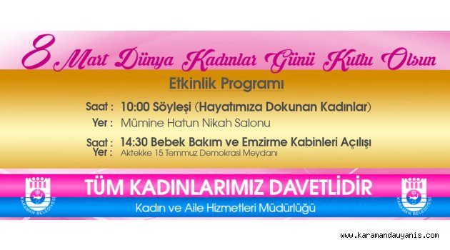 Her yıl 8 Mart tarihinde kutlanan Dünya Kadınlar Günü, Karaman Belediyesi Kadın ve Aile Hizmetleri Müdürlüğü’nün düzenleyeceği etkinlik ile ilimizde de kutlanacak. İlk program; 8 Mart 2017 Çarşamba günü saat 10.00’da Mümine Hatun Nikâh Salonu’nda yapılacak olan “Hayatımıza Dokunan Kadınlar” isimli söyleşi ile başlayacak. Aynı gün saat 14.30’da ise Aktekke 15 Temmuz Demokrasi Meydanı’nda Bebek Bakım ve Emzirme Kabinlerinin açılışı gerçekleştirilecek.