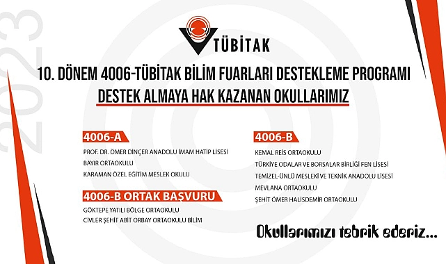 Yapılan değerlendirme neticesinde; Prof. Dr. Ömer Dinçer Anadolu İmam Hatip Lisesi, Bayır Ortaokulu ve Karaman Özel Eğitim Meslek Okulu TÜBİTAK 4006-A bilim fuarı için destek almaya hak kazanırken; Türkiye Odalar ve Borsalar Birliği Fen Lisesi, Temizel-Ünlü Meslekî ve Teknik Anadolu Lisesi, Kemal Reis Ortaokulu, Mevlana Ortaokulu, Şehit Ömer Halisdemir Ortaokulu ile ortak başvuru yapan Göktepe Yatılı Bölge Ortaokulu ve Civler Şehit Abit Orbay Ortaokulu bilim fuarı için destek almaya hak kazanan okullar oldu.