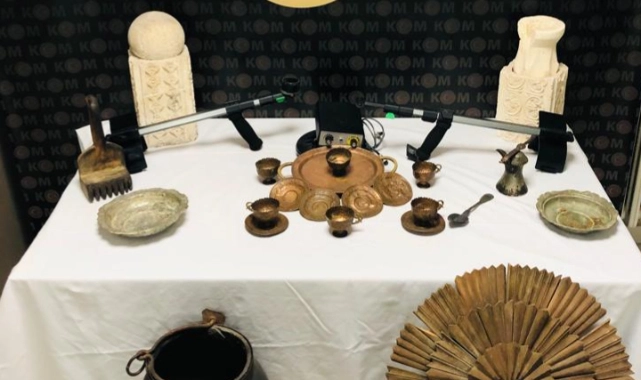 1’er adet taş küre, kapı göbeği, tepsi, kürek, kaşık, cezve ve küp olmak üzere, toplam 24 parça obje ile 1 adet dedektör ele geçirilmiştir.
