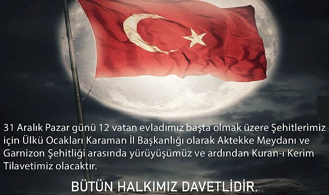Tüm Karamanlıların davet edildiği yürüyüşle ilgili İl Başkanlığı’ndan yapılan açıklamada, ‘’Bu acı dolu zamanlarda bile şehitlerimizin bize öğrettiği en büyük derslerden biri, terörün asla amaçlarına ulaşamayacağıdır. Bizler, tek yürek olduğumuz müddetçe teröristlerin çabaları boşa çıkacaktır. Şehitlerimizi anma ve teröre karşı birlik mesajı vermek amacıyla düzenleyeceğimiz yürüyüşümüz, 31 Aralık Pazar Günü (Yarın) Aktekke Meydanı’nda başlayacak. Saat 14.00 itibariyle başlayacak yürüyüş, şehir mezarlığındaki Garnizon Şehitliğinde yapılacak Kur’an-ı Kerim tilaveti ile son bulacak. Tüm hemşerilerimizi, teröre karşı ortak duruş sergilemek üzere yürüyüşümüze davet ediyoruz.’’ İfadelerine yer verildi.