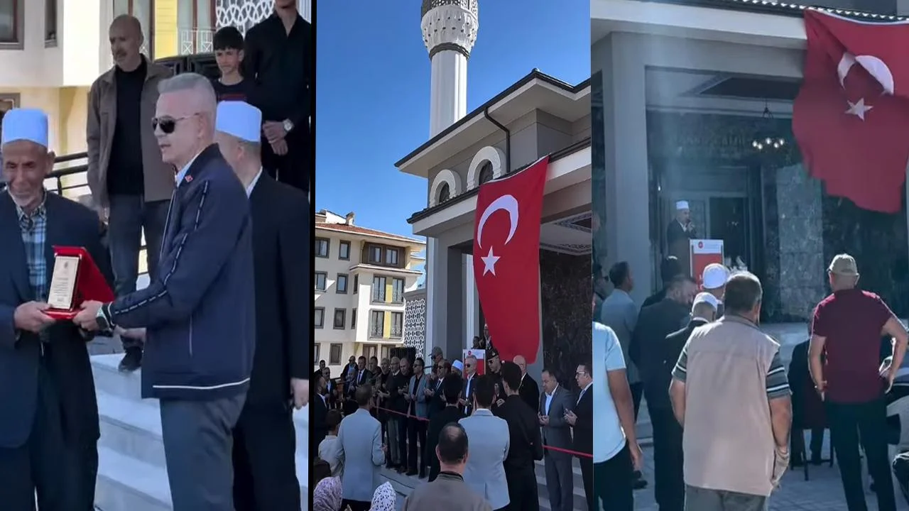 Vali Çiçekli caminin yapımına katkı sağlayan Ahmet Ali Taşer’e plaket takdiminde bulundu.