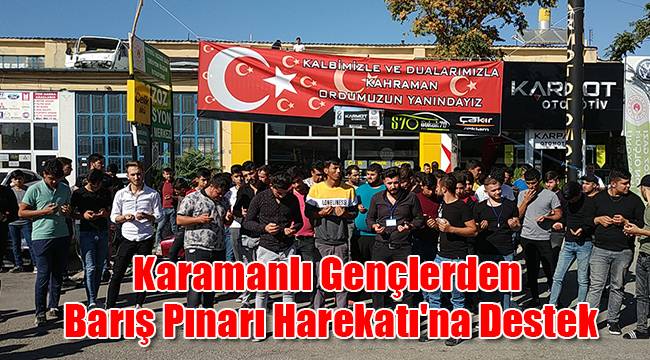 Karaman'da Orta Anadolu Küçük Sanayi Sitesi esnafları ve Karaman Sokak70 Topluluğu Üyeleri, ürk Silahlı Kuvvetlerinin (TSK) Fırat Nehri'nin doğusuna yönelik düzenlediği Barış Pınarı Harekatı'na destek olmak için bir araya geldi.