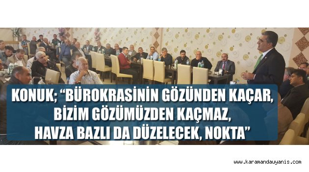 Konuk, planlamanın detay uygulamaları konusunda birçok bölgeden, il ve ilçeden itirazlar geldiğini, bürokrasinin Karaman gibi Konya’da da yereldeki detaylara yeterince hakim olamaması sebebiyle ürün gurubu destekleri ve havza planlamasında düzeltilebilir hatalarla karşılaştıklarını söyledi. Dane mısır uygulamasını örnek gösteren Başkan Konuk, “Konya’nın bazı yerlerine verilmeyen dane mısır desteği Ermenek’e verilmiş ise bunda açık maddi hata var demektir. Bu hataların olmaması için gerekli uyarıları baştan yapmamıza rağmen maalesef sakınılan göze çöp batarmış misali bu hatalar karşımıza çıkmıştır. Ancak hiç birisi düzeltilmeyecek hata değildir ve liste daha yayınlanır yayınlamaz, Konya’nın, Karaman’ın uygulamadan etkilenmemesi için biz Karaman’ın Konya’nın sesi olduk ve en ufak detayına kadar yapılması gerekenleri bir kez daha tek tek, kelime kelime, metrekare metrekare not ettirdik” dedi.