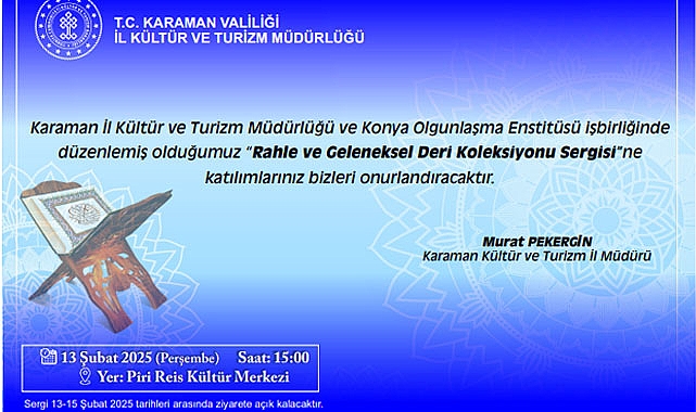 Konya Olgunlaşma Enstitüsü ile Karaman İl Kültür Müdürlüğü tarafından organize edilen “Rahle Ve Geleneksel Deri Koleksiyonu Sergisi” bugün açılacak.