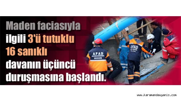 Ermenek Ağır Ceza Mahkemesi'nde görülen davanın bugünkü duruşmasında, tutuklu sanıklar Has Şekerler Madencilik Şirketi sahibi Saffet Uyar, Ermenek Cenne Linyit Kömürü İşletmesi Müdürü ve hissedarı Abdullah Özbey ve aynı şirketin teknik nezaretçisi Ali Kurt; tutuksuz sanıklar maden mühendisleri Cemile Karaca ve Nuray Yetiş, taraf avukatlar ile ölen madencilerin aileleri katıldı.