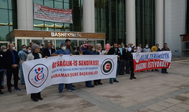 Sağlık İşçisinin Emeğinin Hakkını İstiyoruz, Bizlerin De Sağlık Çalışanı Olduğumuz Gerçeğinin Şartsız Kabulünü İstiyoruz, Nimet Külfet Dengesinde Eşitlik İstiyoruz, sağlık hizmeti verilirken işçinin de emeğinin görülmesini istiyoruz, sizler kabul etmeseniz de sağlık ekip işidir, bizleri mali haklar üzerinden birbirimize düşürmeyin, bizler işyerlerindeki çalışma barışını korumaya çalışırken, eylem ve söylemlerle bu birlikteliği baltalamayın, sağlık çalışanlarının tamamı “pandeminin kahramanıdır”, ortada bir paylaşım varsa herkes hakkı olanı almalıdır, biz sağlık çalışanlarının hizmeti nefes gibidir, kesilince hissedersiniz.”