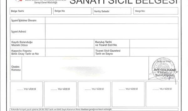 * Sanayi Sicil Belgesi Başvuru Ücreti : 300 TL.