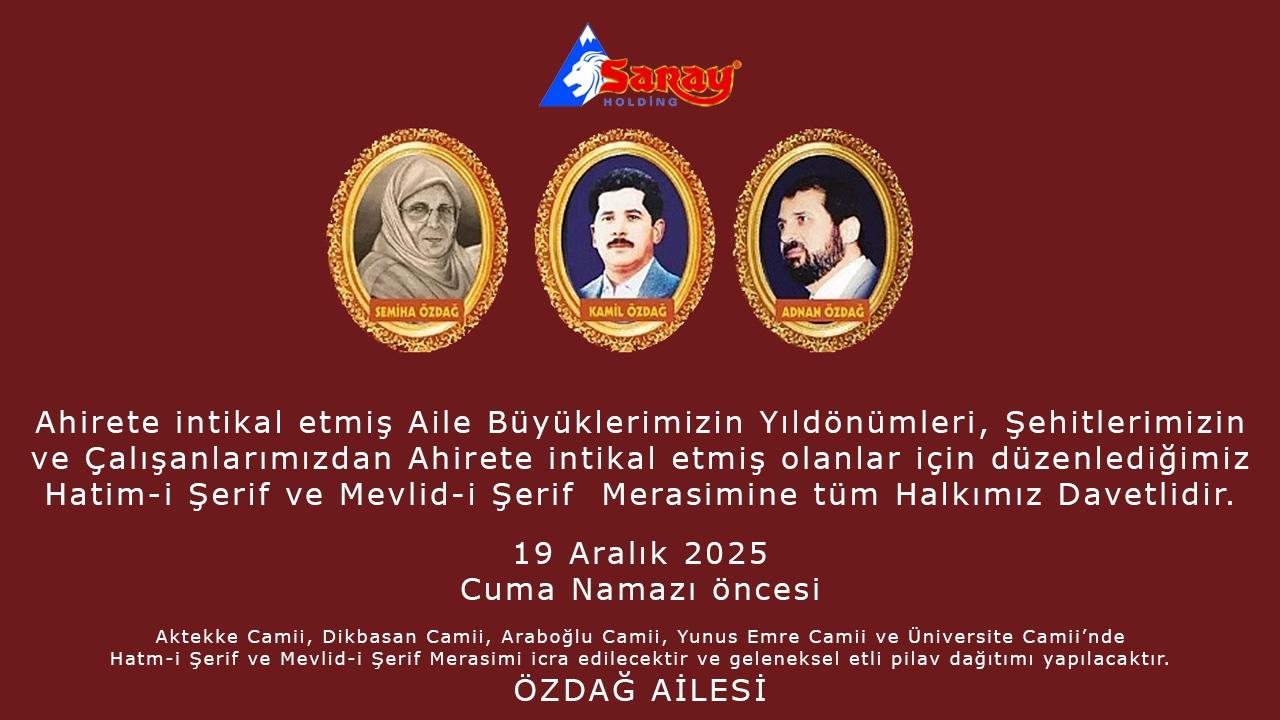 “İlimizin kuruluşlarından olan SARAY HOLDİNG’ in sahipleri ÖZDAĞ Ailesinin değerli büyüklerinden rahmetli babaları hayırsever insan Durhasan’ın Kamil ÖZDAĞ’ın vefatının 56.yıl dönümünde, Anneleri Hayırsever insan Semiha ÖZDAĞ’ın vefatının 6 yıl ve SARAY HOLDİNG’ in kurucularından olan rahmetli Ağabeyleri Hacı Adnan ÖZDAĞ’ın vefatının 30.yıl dönümünde, Vatan savunmasında şehit düşen tüm Şehitlerimizin ve Saray Çalışanlarının ebediyete intikal etmiş olanların ruhlarını yâd etmek amacıyla 19 ARALIK 2025 günü Cuma Namazı öncesi Aktekke Camii, Dikbasan Camii, Arapoğlu CAMİİ, Yunus Emre Camii ve Üniversite Camii’nde Hatm-i Şerif ve Mevlid-i Şerif Merasimi icra edilecektir ve Geleneksel etli pilav dağıtımı yapılacaktır.