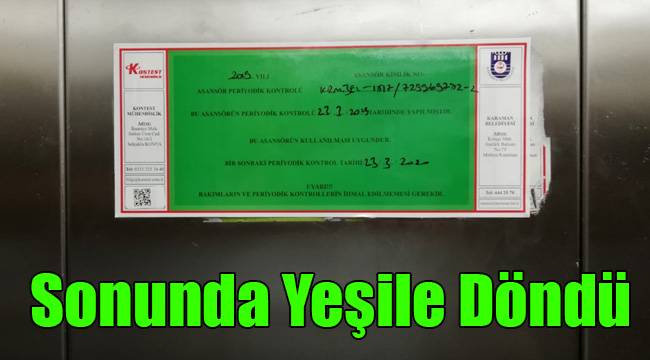 Karaman Kırbağı 4. TOKi konutlarında bulunan asansörlerin yapılan periyodik kontrollerinde çeşitli nedenlerden kullanıma uygun olmadığı belirlenmişti. Bu tespite rağmen asansörler kullanıma açık bırakılarak vatandaşların hayatı hiçe sayıldı. Asansörlerin hareketlerinde çıkardığı sesler, sürekli sarsılması ve durması gereken kattan yukarıda durması vatandaşları yeterince korkuttu. Neyse ki TOKİ sakinleri 60 gün içerisinde kabustan uyandı. Asansörlerin en son yapılan kontrollerinde verilen kırmızı etiket yeşile döndü.