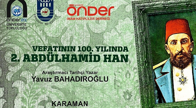 Araştırmacı Tarihçi Yazar Yavuz Bahadıroğlu Karaman'a geliyor. Karaman Belediyesi ve Karaman Önder'in organize ettiği Vefatının 100. Yılında II. Abdulhamid Han konulu konferans 21 Şubat Çarşamba günü KMÜ 15 Temmuz Konferans Salonunda düzenlenecek.