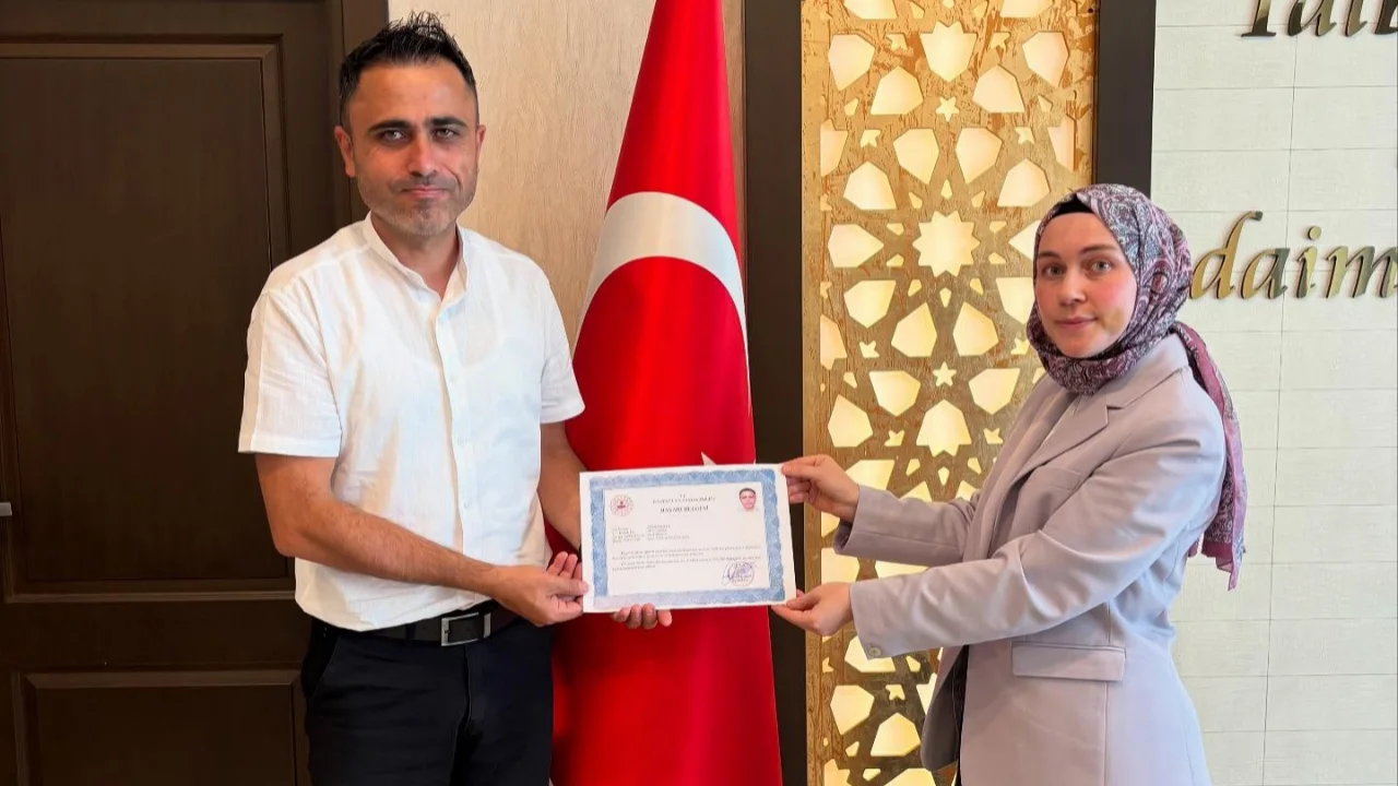 Kaymakam Neslihan Çakır, eğitime sunduğu katkılardan ötürü Ahmet Kıncı’ya başarı belgesi takdim etti.