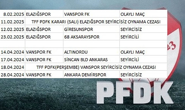 Elazığspor ise 8 Şubat 2025 tarihinde Vanspor ile karşı karşıya geldi. 11 Şubat’ta PFDK tarafından Elazığspor’a 1 maç seyircisiz oynama cezası verildi. 12 Şubat’ta ise Elazığspor, kendi sahasında Giresunspor ile seyircisiz oynadı. Hızlı alınan bu karar sonrasında özellikle Motolux 68 Aksaraysporlu taraftarlar, her zaman perşembe günü açıklanan PFDK kararının neden salı günü açıklandığı sorgulamaya başladı.