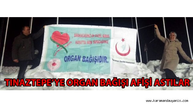 Karaman’da organ bağışı konusunda halkımızın dikkatini çekmek, konuya duyarlılığı arttırmak amacıyla özveriyle çalışan Hemşire Sultan Günaştı ile beraberinde kendileri bağışlanan organlarla yaşama devam eden ve bu uğurda gönüllü olarak hizmet veren Ercan Çalışkan ve Yusuf Sütçü Antalya’dan organ bağışı ile ilgili çalışmadan dönerken Tınaztepe’de bir anı bırakmak istediler. Seydişehir Antalya üzerinde Tınaztepe Mevkiinde yoğun kar yağışı ve tipiye aldırmadan Devlet Hastanesine ait organ bağışı konulu afişi yüksek bir zirveye astılar.